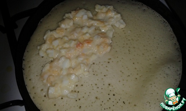 На нагретую сковороду, смазанную масло вылить тесто, подождать пока слегка поджарится и выложить начинку ближе в центру, не доходя на края примерно 1 см, накрыть другой стороной блинчика. Прижать лопаткой края, "склеивая" их. Затем перевернуть и обжарить с другой стороны