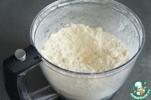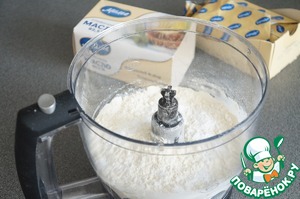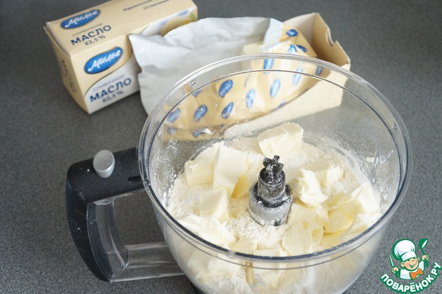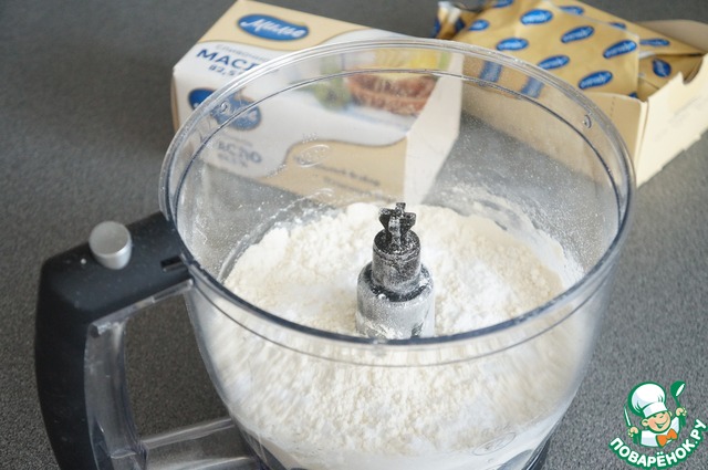 Быстро порубить в крошку. Если нет комбайна, можно просто порубить масло в муке используя два острых ножа. -