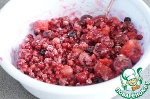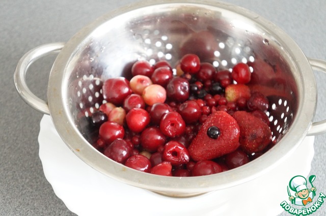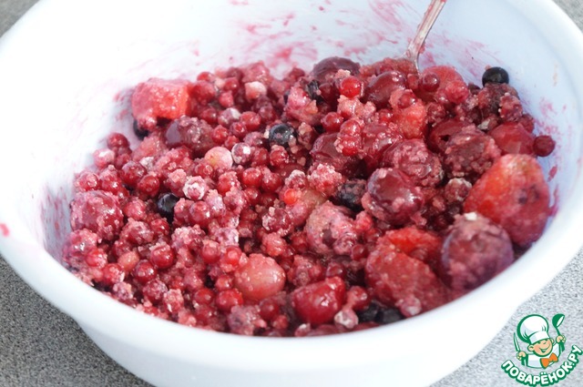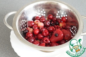 - Ягода (у меня вишня, брусника, немного смородины и клубники) — 350 г