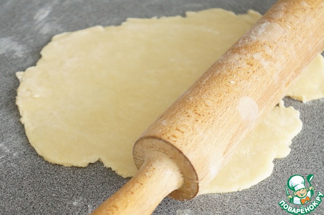 Влить воду, быстро замесить тесто, возможно понадобится ещё пару ложек воды. Разделить тесто на две неравные части, завернуть в плёнку или пакеты, слегка придавить и убрать в холодильник на 40-60 минут. Форму для пирога тоже убрать в холодильник. -