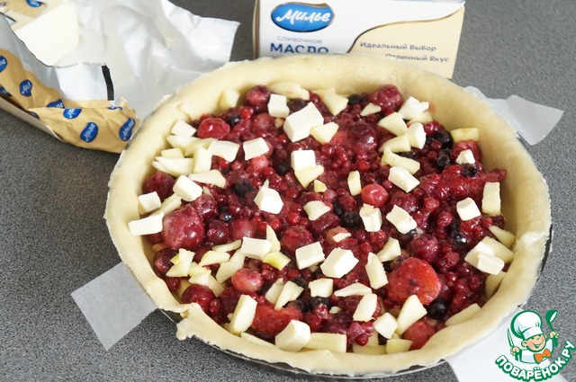 Разложить кусочки сливочного масла. Масло нужно не только для вкуса, после остывания готового пирога оно служит дополнительным загустителем для начинки. Края теста смазать яйцом. -