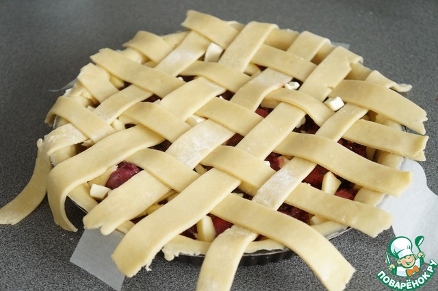 Полосы переплести, залепить на основе. Смазать пирог яйцом и убрать в холодильник на несколько минут, пока разогревается духовка.