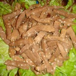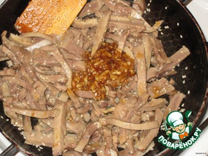 Язык порезать соломкой, выложить в сковороду, добавить масло и кунжут, посолить. Все прогреть, НЕ зажарить, а именно прогреть на медленном огне 5-7 минут.