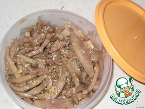 Язык снять с огня, сразу залить маринадом, перемешать.