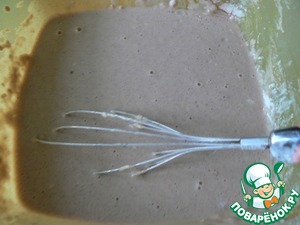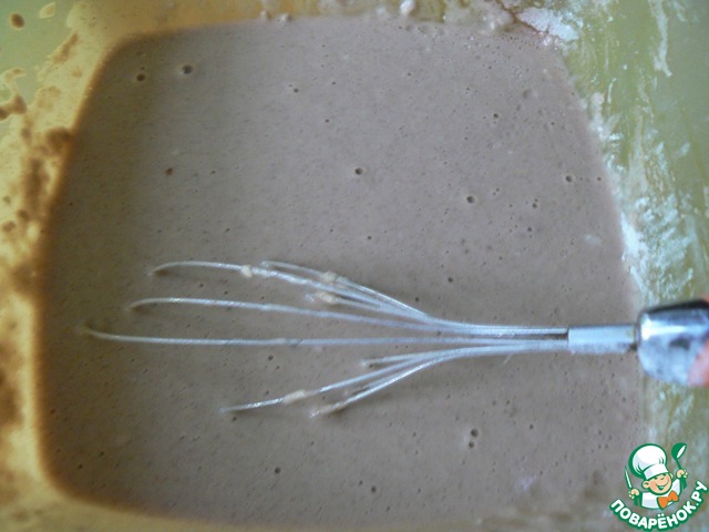 Добавляем просеянную муку, какао, вливаем масло, хорошо перемешиваем и убираем в теплое молоко, примерно на час, за это время один раз мешаем