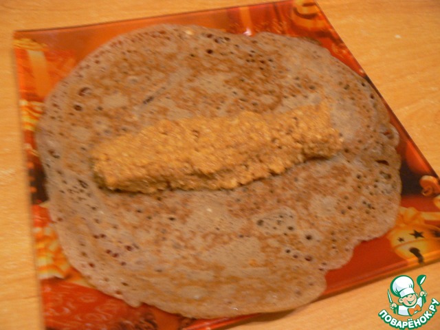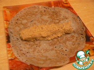 Блинчики пожарить с двух сторон. Ближе к центру выложить начинку. Свернуть, формируя "батончик"