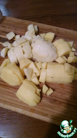 Затем добавляем порезаный картофель. Количество регулируйте на свой вкус, главное, что бы его было не больше, чем фасоли. На самом деле, можно и без него обойтись, если вы считаете каллории.