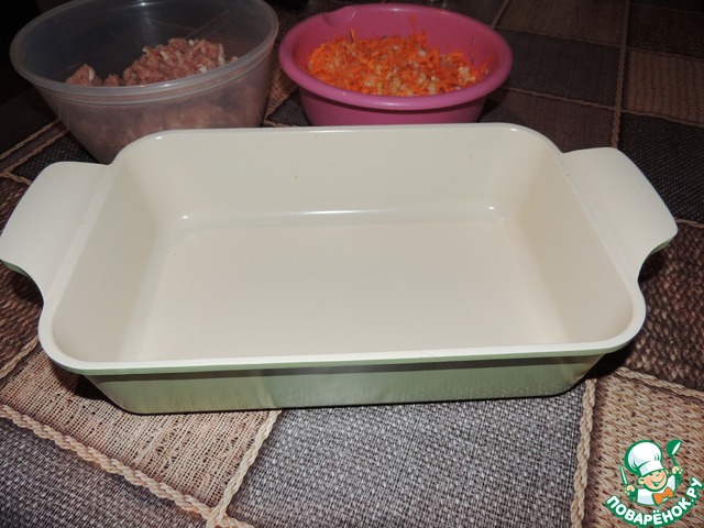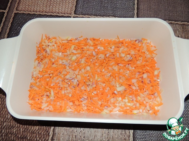 Лук и морковь мелко режем (я морковь натёрла на крупной тёрке), перемешиваем и выкладываем в высокую форму для выпечки половину от получившегося количества овощей, делаем как бы подушку