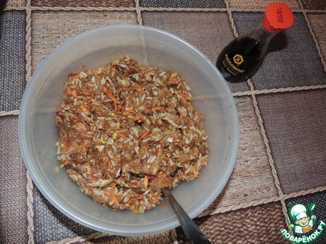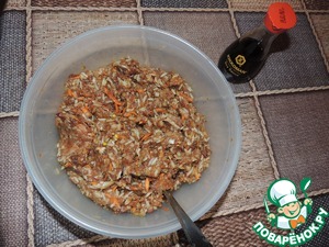 Тщательно перемешиваем и добавляем соевый соус, по вкусу (кто не любит, просто солим)