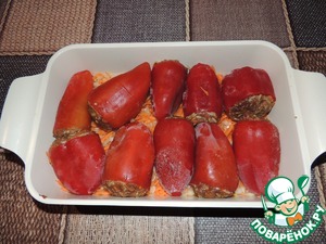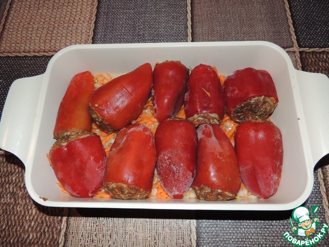 Фаршируем полученной смесью перчик и выкладываем на овощную подушку (у меня перчик замороженный)