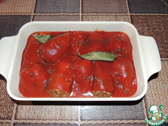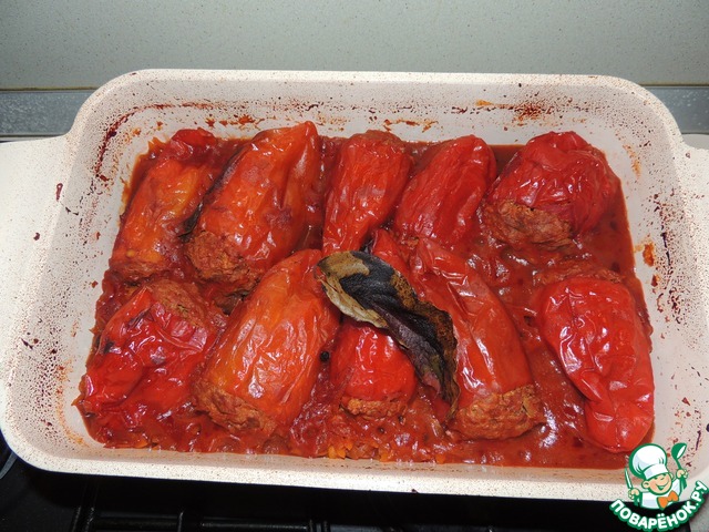 Я вот, прочитав рецепт, не сразу отметила этот момент на фото. Уложила в глубокую жаровню в два слоя, и потом мне уже было и лень раскладывать их по разным противням да и посуды в мойку добавлять не хотелось. У меня тоже перец был замороженный, как раз освобождала полки от остатков зимних запасов, и начинила перцы сразу из двух пакетов, как раз 20 штук, точно по рецепту килограмм фарша и ушел. Но поскольку лежали мои красавцы в два слоя, то и тушились они более часа. А все остальное - по рецепту.