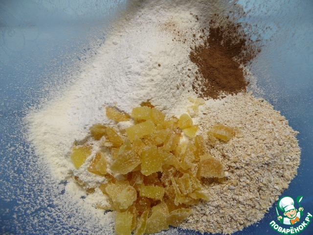 • Овсяные хлопья измельчить, смешать с просеянной с разрыхлителем мукой, измельченным засахаренным имбирем, солью, корицей и мускатным орехом.