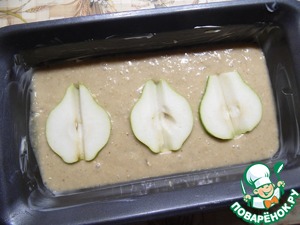 • Груши разрезать напополам, вырезать семечки. Половинки выложить слегка вдавливая в тесто, срезом вверх.