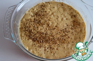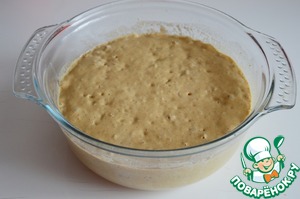 Все ингредиенты тщательно перемешать, добавить теплую воду, венчиком замесить тесто до однородности. Накрыть крышкой или пленкой, оставить в теплом месте на 1 час.