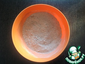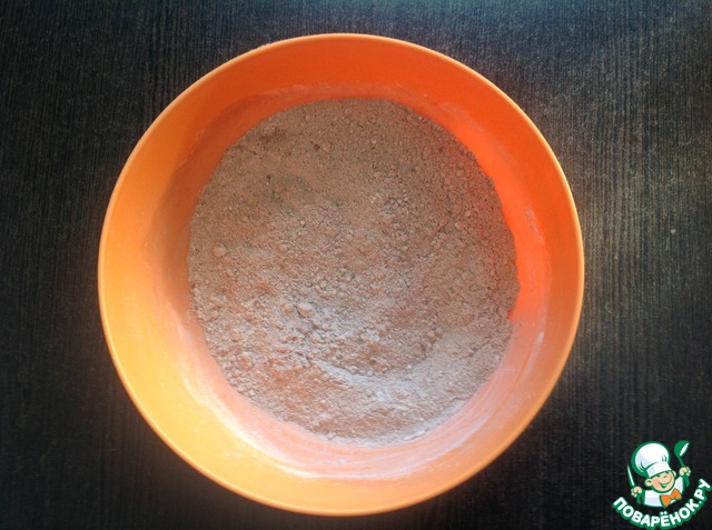 В большой миске смешать муку, какао, сахар, разрыхлитель, корицу и соль. -