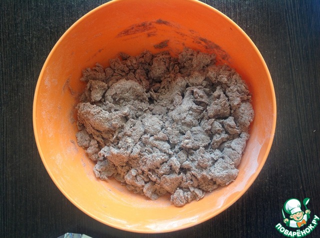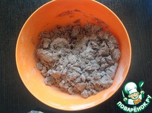 Натереть на терке замороженное масло в муку, растереть его пальцами, пока смесь не будет напоминать грубую крошку. Отложить в сторону. Этот процесс я доверила блендеру, поэтому масло просто порезала кубиками.