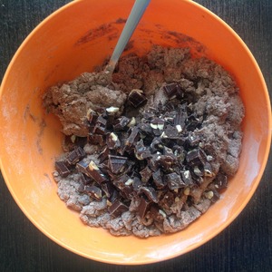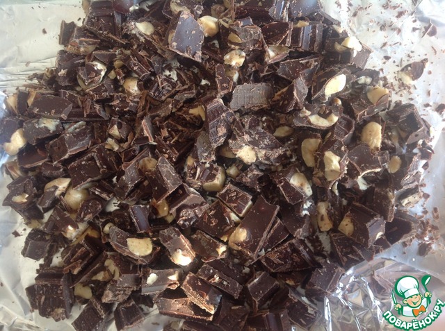 Шоколад крупно порубить. У меня темный горький шоколад с цельным фундуком.