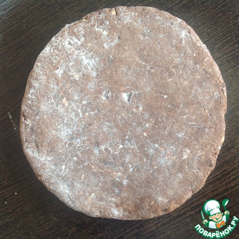 Скатать тесто в шар на слегка присыпанной мукой поверхности и перенести тесто на подготовленный противень. Аккуратно сформировать диск диаметром 20 см.