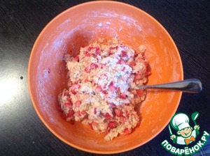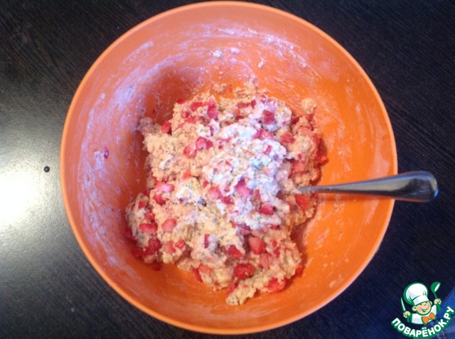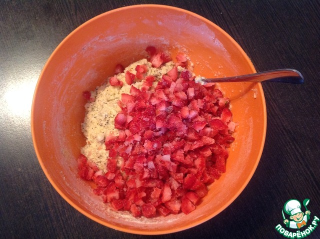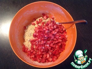 Аккуратно вмешать кусочки клубники в тесто, стараясь сильно их не мять.