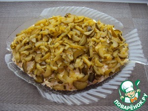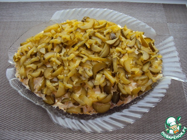 Далее выкладываем слой порезанных маринованных огурцов (при необходимости огурцы слегка отжать).