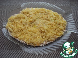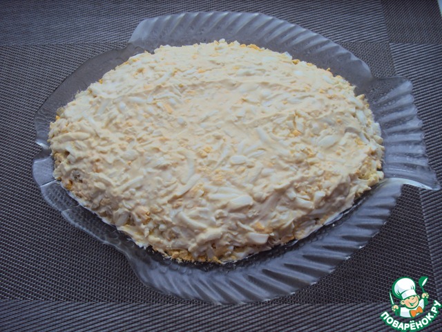 Третьим слоем выложить натертые на терке яйца, промазать майонезом.