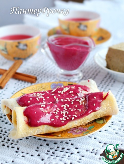 Простой, но необыкновенно вкусный соус с кисло-сладкой ноткой обязательно понравится сладкоежкам! А еще он такой яркий и красочный, что обязательно разгонит хандру и поднимет настроение. Да и блины не простые: мягкие, тающие, приготовленные на топленом молоке.