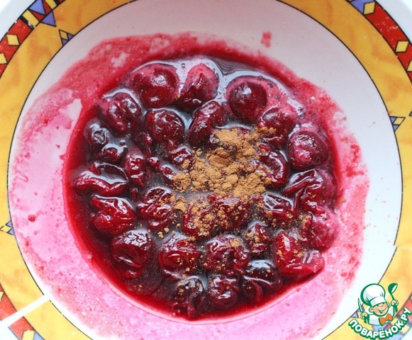 У вишни достать косточки. Если используете как я, замороженную вишню, поставьте ее в микроволновку на 2-3 минуты. Добавить корицу.