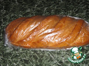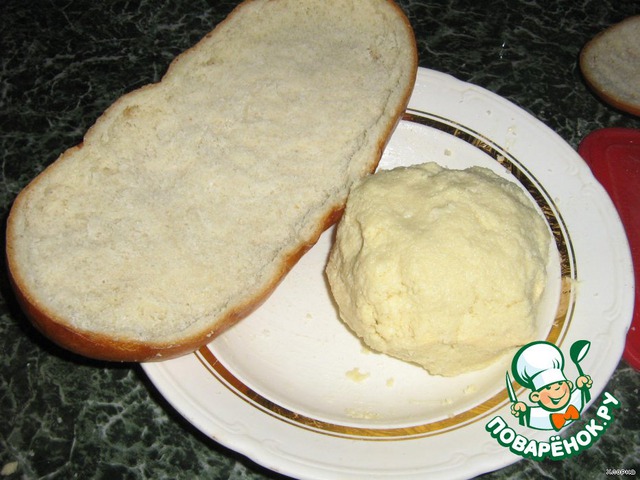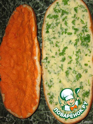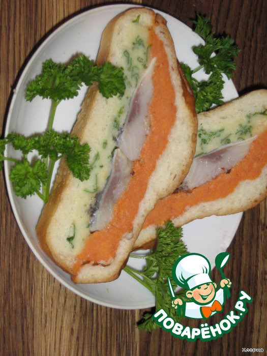 На одну половину батона выложить валетом 2 филе селедки, чуть вдавить в начинку.