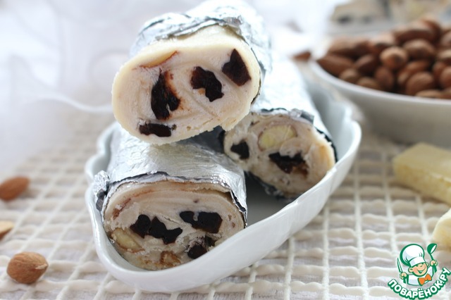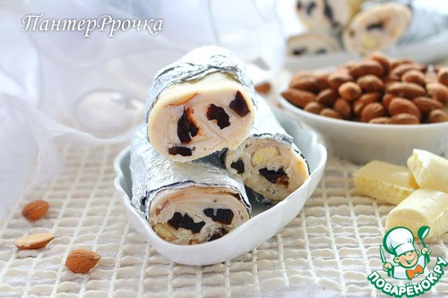 • Смешать маскарпоне, белый шоколад, сгущенное молоко, чернослив и миндаль (и разрезанный, и измельченный). Если смесь очень густая, можно добавить немного молока.