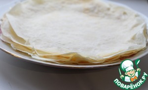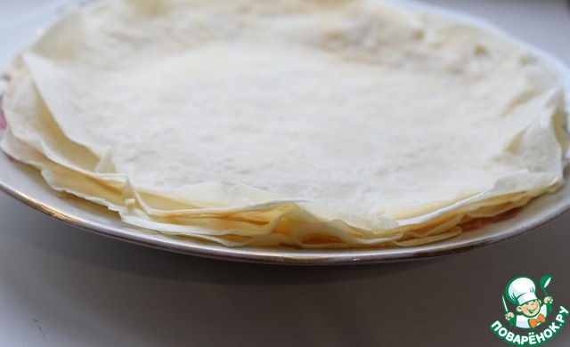 • Нанести смесь на блинчик достаточно толстым слоем.