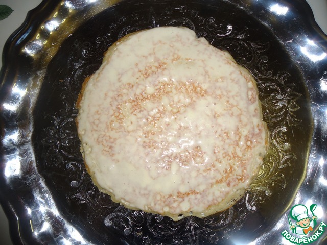 Можно собирать торт, первый блин смазать сметанным кремом.
