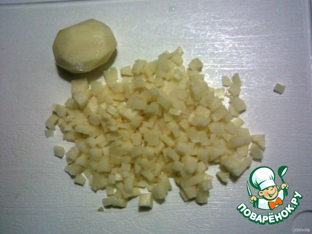 Режу мелкими кубиками картошку, бросаю в кипящую воду (1,5л.), -