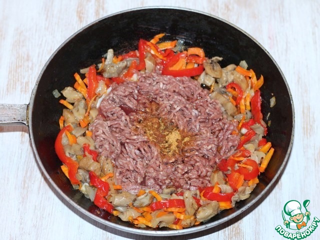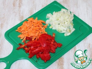 3. Обжариваем на растительном масле репчатый лук до прозрачности. Добавляем морковь, болгарский перец и грибы, перемешиваем. Тушим до готовности.