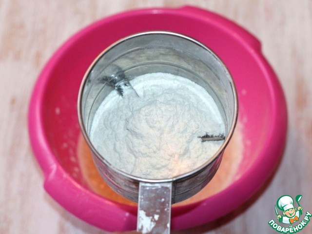 Просеиваем муку и частями вмешиваем в тесто (5 мин). В конце замеса вмешиваем 1-2 ст. л. растительного масла. Замешиваем гладкое не липнущее к рукам тесто.