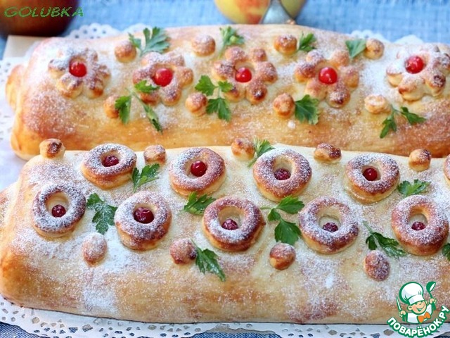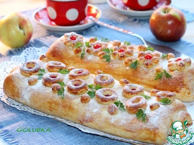 Выпекала 2 пирога на одном противне, где кружочки испекся быстрее, чем с цветочками. Поэтому пришлось немного их по-пудрить/