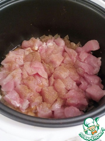Нарезаем курицу кубиками и добавляем к луку, посыпать приправой карри.