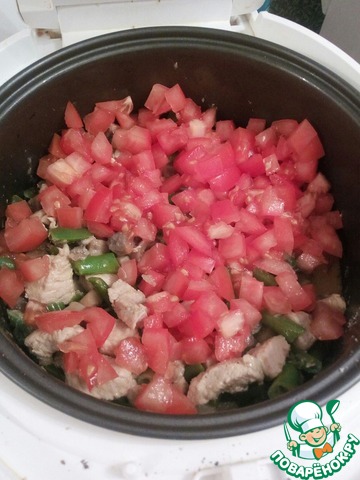 Через 15 мин, как добавили фасоль, добавляем нарезанные помидоры. Жарим до испарения сока. Солим по вкусу