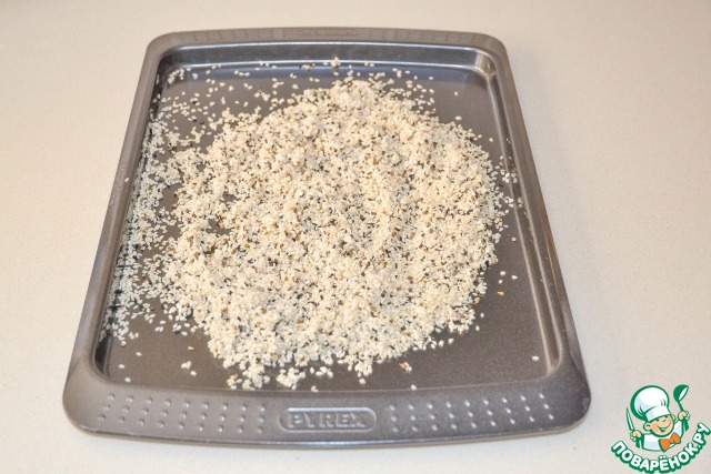 Сначала соединяем кунжут с анисом, кладем в дуршлаг и промываем холодной водой. Даем воде стечь и перекладываем на небольшой противень или большую плоскую тарелку.