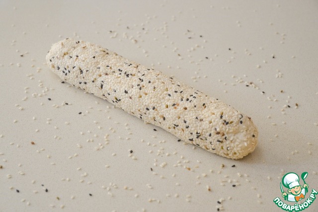 Затем рулетик хорошенько прокатываем во влажном кунжуте.