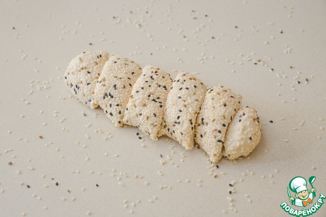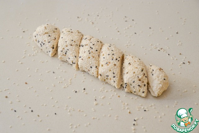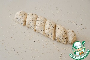 Перекладываем на рабочую поверхность и снова хорошо прокатываем, чтобы кунжут с анисом не осыпались. -
