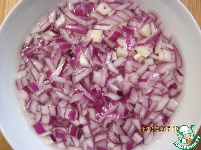 • Лук мелко нарезать и засыпать в маринад. Дать постоять примерно 30 - 40 минут. Затем откинуть лук на дуршлаг и дать жидкости полностью стечь. Добавить к остывшему, желательно охлажденному, мясу.