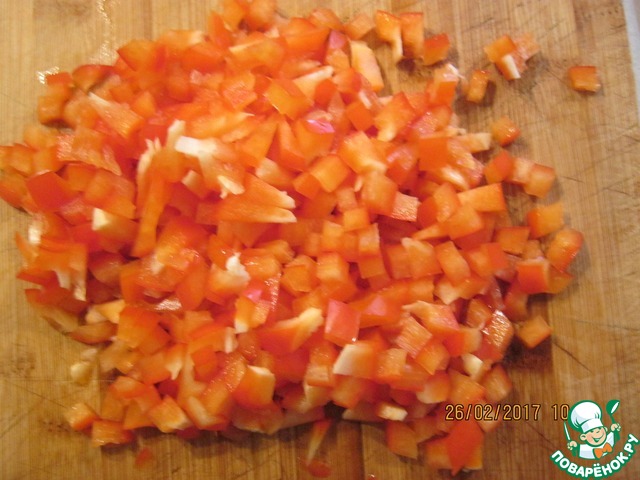 • Перец освободить от семян и нарезать некрупным кубиком. Добавить к мясу с луком.