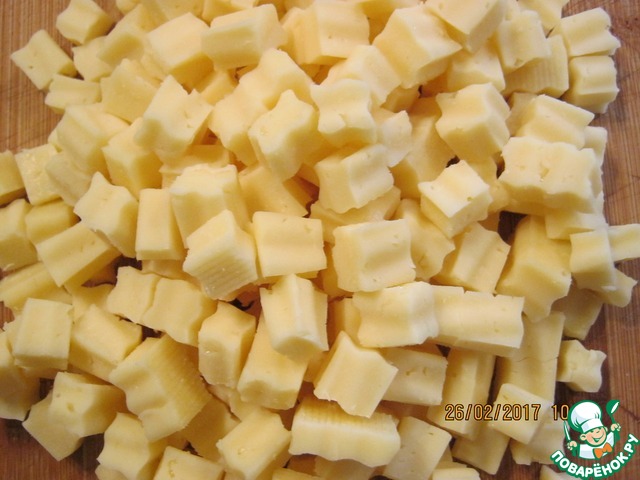 • Сыр нарезать некрупным кубиком. Для того, чтобы смотрелось эстетичнее и чтобы придать некоторую структуру салату, я использую для нарезки сыра волнистый нож. На вкусе, конечно, это не отражается, но выглядит более привлекательно. Сыр добавить к остальным ингредиентам.