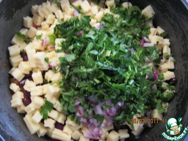 • Фасоль откинуть на дуршлаг, дать жидкости стечь. Я еще дополнительно слегка промываю холодной водой и даю полностью стечь и только потом добавляю в емкость с будущим салатом.