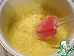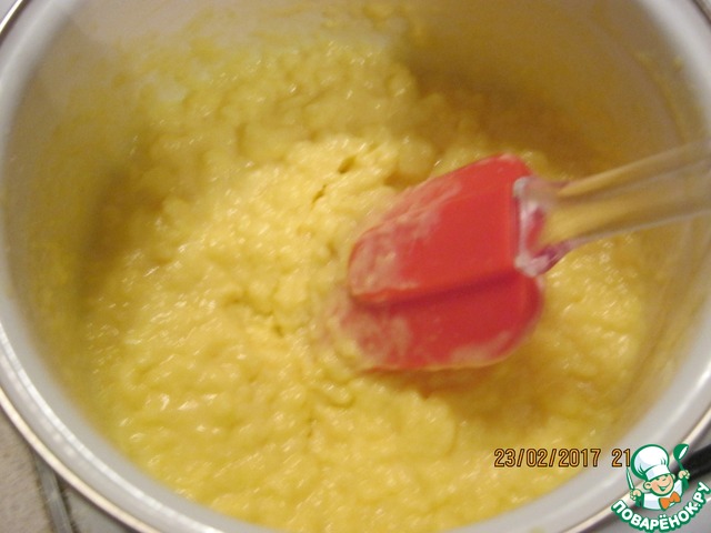При постоянном помешивании проварим массу до загустения. Переложить заварную часть в миску, накрыть пленкой "в контакт" с поверхностью и дать полностью остыть. Затем убрать в холодильник на ночь.