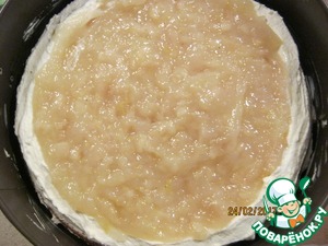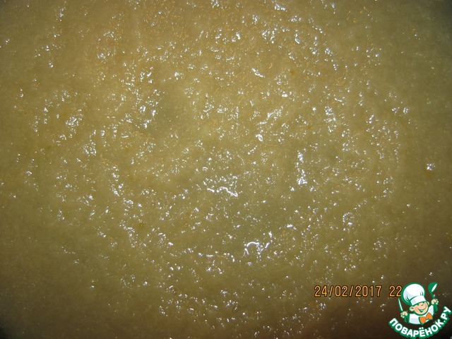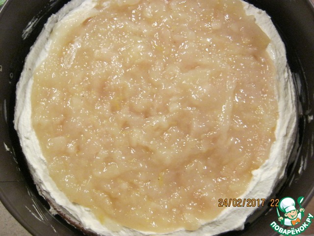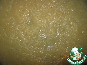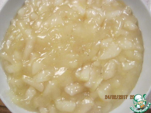 Пока остывает прослойка, сварим грушевое пюре для баваруа. Для этого также очистить груши от кожи, семян и прожилок. Затем натереть их на мелкой терке в кастрюлю, добавить лимонный сок и проварить на небольшом огне, периодически помешивая. Уваривать до загустения. Время зависит от сочности груш. У меня ушло 40 - 50 минут. В горячее пюре влить распущенный на водяной бане желатин из одной чашки, процеживая через ситечко. Хорошо перемешать и отставить в сторону.