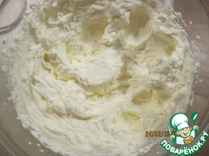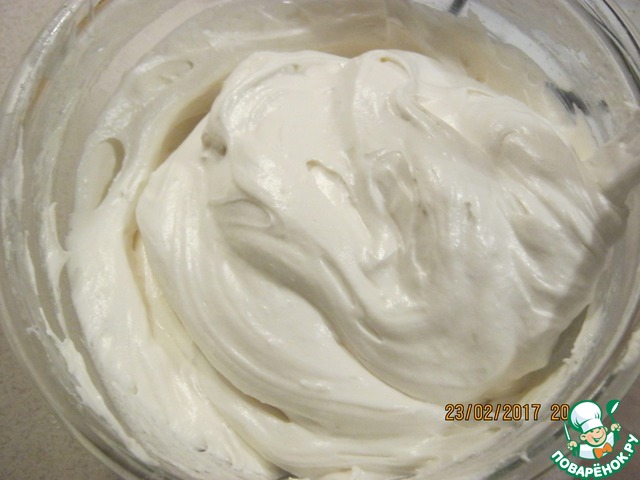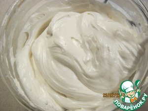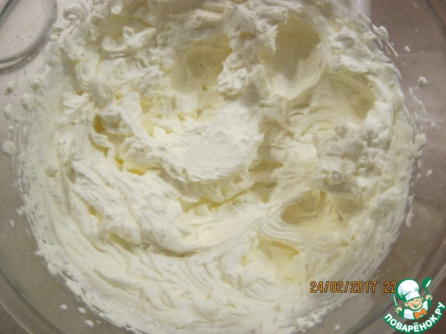 Тем временем взбить 500 мл сливок до плотных пиков. Отложить от общего количества 2 - 3 столовых ложки для сборки первого слоя торта.