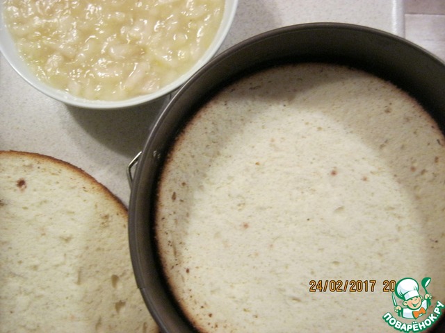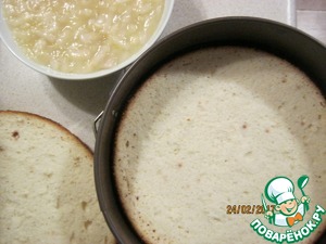 Приступим к сборке торта. В разъемную форму уложить первый корж.