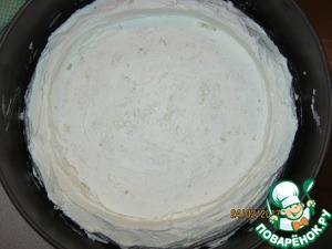 В получившийся "резервуар" выложить остывшую начинку. Накрыть вторым коржом и слегка прижать. Вокруг полученной конструкции нарастить бортики.