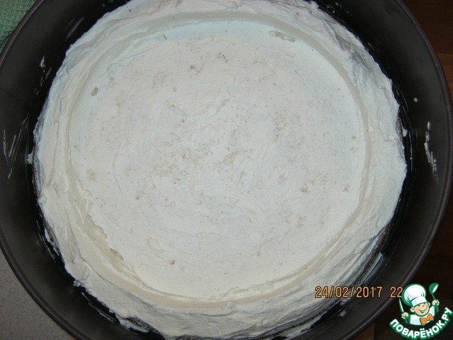 Слегка смазать его сливками, а по бокам сформировать из взбитых сливок бортик высотой примерно 1,5 см.